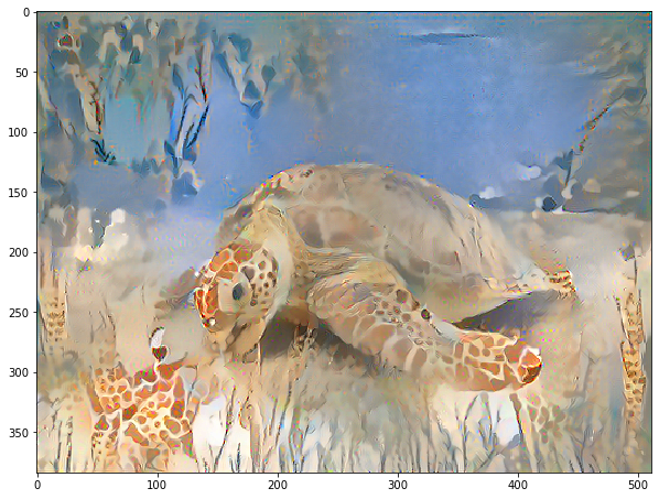The implementation of the Neural Style Transfer was coordinated through the Tensorflow framework. For the initial application we use a content image which is a image of a Green Sea Turtle and Ashlee's children book style illustration of a Giraffe.